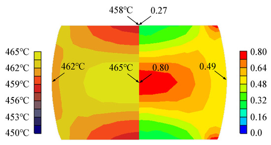 Figure 8 shows the material’s predicted temperature and effective strain at the conditions of 450 °C temperature and 10 s−1 strain rate, using the RFCs–AFTCs. It is noted that the experimental temperature at the measurement point is 461 °C, while its corresponding prediction is 462 °C, implying that the RFCs–AFTCs are quite accurate.
