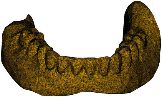 The model in STL format was a network of linked triangles, which, for a large number of elements, approximates the complex shape of a mandibular overdenture. After scanning, the images were imported into the freely available open-source software, Meshmixer 3.5 (Autodesk Inc., San Rafael, CA, USA, www.meshmixer.com, accessed on 18 March 2022), in which the inherent errors resulting from scanning were corrected, to obtain surfaces that allowed for further analysis by the FEM. Using the freely available open-source software, FreeCAD (www.freecadweb.org, accessed on 18 March 2022), it was possible to import the model in STL format, check it, reduce the dimensions by reducing the number of network nodes and obtain the finite element model. The obtained results were exported to the freely available open-source software, ParaView (Kitware Inc., Clifton Park, NY, USA, www.paraview.org, accessed on 18 March 2022), which allowed their extensive presentation. The model of the mandibular overdenture is presented in Figure 1.