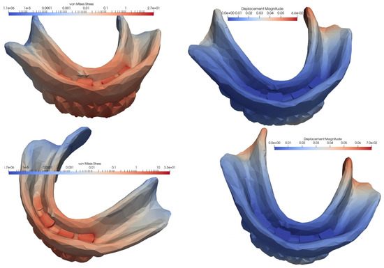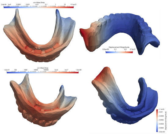 In this study, the mandibular overdenture was made from thermoplastic polymer, namely, Vitaplex (Roko Dental Systems, Częstochowa, Poland), which was injected under pressure, using an automated injection device, Multipress Eco (Roko Dental Systems, Częstochowa, Poland). The considered mechanical properties were the modulus of elasticity E = 2684 Mpa, according to the manufacturer, and Poisson’s ratio ν = 0.28, which was characteristic of acrylic resins [].