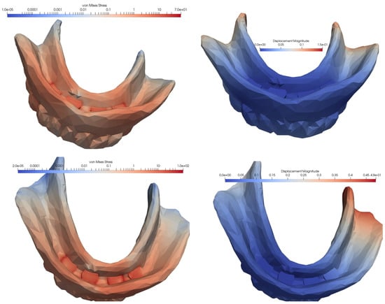The von Mises stresses and displacements generated by the frontal loading of an overdenture on four interforaminally inserted MDIs (top), compared to the loss of a distal implant (bottom).