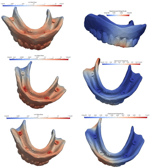The von Mises stresses and displacements generated by the frontal loading of an overdenture on four MDIs, two of which are inserted in the canine area and two in the molar area (top), compared to the situations of loss of an implant in the molar area (middle) or the canine area (bottom).