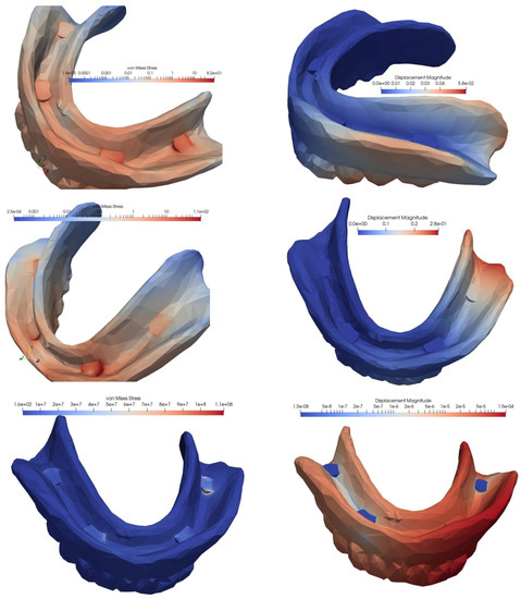 The von Mises stresses and displacements generated by the bilateral loading of an overdenture on four MDIs, two of which are inserted in the canine area and two in the molar area (top), compared to the situations of loss of an implant in the molar area (middle) or the canine area (bottom).