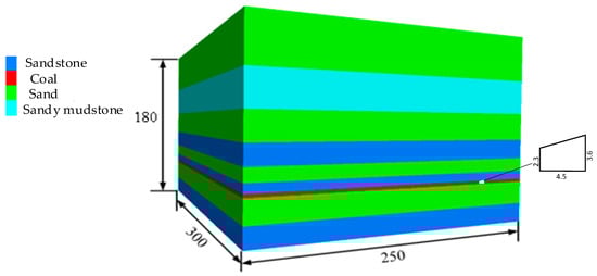 Based on actual conditions of no. 2424 upper roadway, considering the hosting of coal seam and mining mode, and considering the influence of boundary effect and advanced support pressure, make the model meet the full extraction []. The FLAC3D calculation model is established to simulate the stress distribution and deformation of surrounding rock after primary and tertiary support. The model size is 250 m × 300 m × 180 m and is divided into 2,358,781 elements, as shown in Figure 1. Using the Mohr–Coulomb model, the floor is fixed, the sides are horizontally simply supported, and the top is a free border. Owing to the roadway depth of 1300 m, the vertical stress of 29.05 MPa is applied to the upper surface of the model, and the horizontal displacement constraint is applied to the rest of the model.