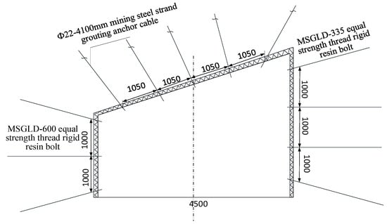 Immediately after the excavation of the roadway, no. 2424 upper roadway is supported, and bolt, anchor cable, and diamond mesh combined support are carried out in the whole roadway. Roof centered on the central axis of roadway, installation of Φ22–4100 mm mining steel strand grouting anchor on both sides, each anchor cable lengthens anchorage, anchor cable spacing 1050 × 1000 mm; MSGLD-600 equal strength thread rigid resin bolt is used in the middle of the two sides; MSGLD-335 equal strength thread rigid resin bolt is used in the top and seat angles, and the row spacing is 1000 × 1000 mm. The roadway support is shown in Figure 2, and the numerical calculation results are shown in Figure 3.