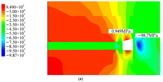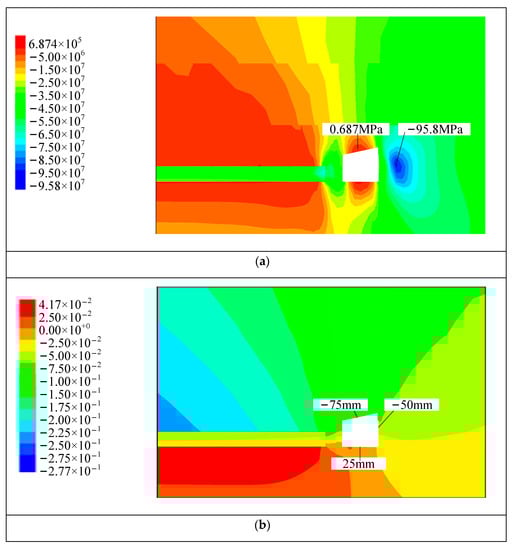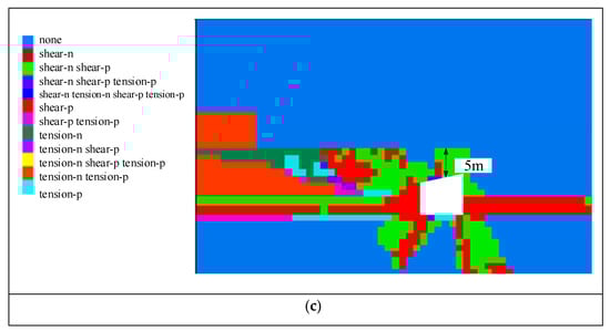 It can be seen from Figure 5 that the vertical stress concentration occurs on the entity coal side of the right side of the roadway. The vertical stress peak is about 3.5 m from the right side of the roadway, and the size is 95.8 MPa. In the multi-level support, there is a certain degree of deformation in the roadway surrounding rock; the roadway roof subsidence is 75~100 mm, the maximum deformation of the floor is 25 mm, the maximum deformation of the two sides is 50 mm; The adjacent roadway around the working face is mainly a compression–shear failure, but there is tension-compression failure above the cutting line. The plastic zone of the main roof of the roadway is basically bounded by the top-cut line, and the failure range of the plastic zone of the roof is between 0~5 m. The plastic yield zone is along the goaf side, and the rest is the elastic zone.