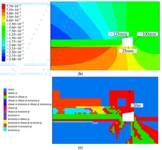 Simulation results of once support, (a) vertical stress distribution diagram, (b) vertical displacement distribution map, (c) distribution diagram of the plastic zone.