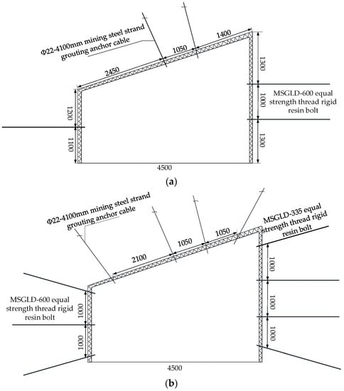The current study provides strong technical support for the stability of surrounding rock in deep mining roadways. However, due to the characteristics of high stress, frequent dynamic load disturbance, and complex geological structure, it is often difficult to ensure the safety of surrounding rock with one support. Sometimes strong support can effectively control the deformation of surrounding rock, but the cost is very high. Therefore, multi-level support has been recognized by some scholars and field engineers. Liu et al. [] adopted stepped combined support, advanced support, once support, and secondary support of the top of the heading face cooperated with each other, spray anchor grouting, and other means to realize the control of excavation construction safety and surrounding rock stability. Li et al. [] analyzed the stress and strength adjustment process of surrounding rock in the support process of soft rock roadway and combined with the rheological mechanics model of soft rock roadway, deduced the theoretical formula of the optimal time of secondary support, and used it in engineering practice to better control the stability of roadway surrounding rock. Through practice, Li et al. [] found that bolt length, initial anchoring force, stiffness, and other multi-level support parameters play a vital role in controlling roadway deformation and roadway safety.