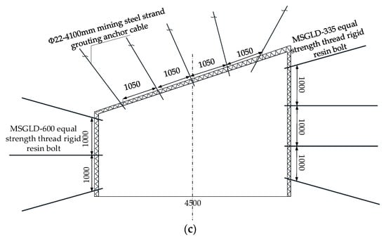 Based on the above research, the combined support of ‘grouting anchor cable + equal strength thread steel resin bolt + U-shaped steel connecting beam’ was used in no. 2424 upper roadway and the tertiary support scheme were adopted, construction scheme was consistent with the tertiary support simulation scheme. Once support is the basic support, that is, the immediate support after roadway excavation, secondary support is the reinforcement support of the top and bottom angle of the roadway when once support reaches a new balance. When the secondary support was completed, the working face pushed 50 m, and the advanced support was 200 m. According to the principle of graded support, the specific multi-level support method is shown in Figure 4.