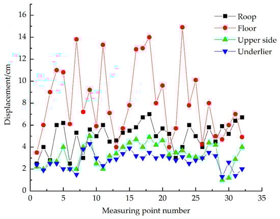 To verify the effect of the control technology proposed above in field application. During the tunneling period of the working face, a surrounding rock deformation monitoring station is set up every 40 m; the station follows a head-on setting. A total of 32 deformation monitoring stations were set up at different positions of no. 2424 upper roadway roof and floor. Using a laser range finder to monitor the displacement of the roadway roof and floor and two sides to obtain the total deformation of surrounding rock at each measuring point of the upper roadway. The monitoring results are shown in Figure 6.