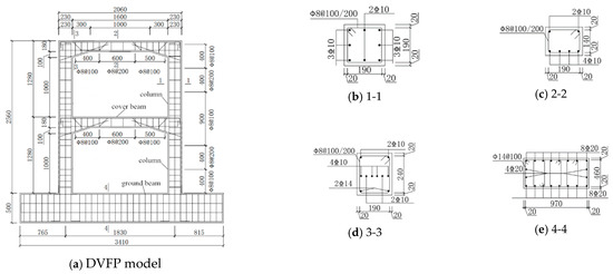 Four DVFP specimens with the same dimensions and reinforcement at 1:5.5 scale were designed and cast, and pre-damaged by static testing to simulate varying degrees of seismic damage, numbered from KJD-0 to KJD-3. The size and reinforcement condition of the specimens are shown in Figure 1. The longitudinal reinforcement ratio of column and cover beam are 1.19% and 1.14%, respectively, and the details of reinforcement are shown in Figure 1. The concrete strength of the specimen was C40 and the average tested compressive strength of the concrete cube at 28 days was 33.8 MPa (cube size: 150 mm × 150 mm × 150 mm). The mechanical properties of steel are shown in Table 1. The mechanical properties of CFRP, CFRP sheets mucilage and mucilage are shown in Table 2.