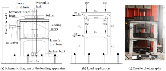 The DVFP model was attached to the strong floor using 8 high-strength bolts. The vertical load adopted the self-reaction system, which is composed of oil jack, reaction platform, leading screw and spreader steel beam, the loading device. The test site is shown in Figure 2. The vertical loads were applied to the first and second floor cover beams, respectively. The horizontal cyclic load was applied by the actuator at the ends of the upper and lower cover beam in the proportion of 2:1 through the spreader device on the column side.