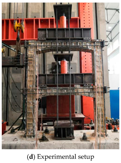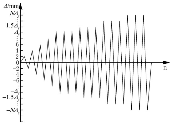 During the test, a constant axial load was applied at the cover beam on the first and second floors and the horizontal force was cycled under a lateral displacement control mode. Before the yield, one cycle was imposed with 2 mm and 1 time step for each loading step. After the specimen entered the yield stage, the lateral load repeated three cycles at the displacement levels of 0.5Δy, 1Δy, 1.5Δy, …, until the load decreased to less than 85% of the peak load or it failed. The loading system is shown in Figure 3.