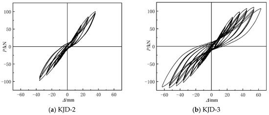 The recorded P-Δ curves of the four specimens are shown in Figure 9. At the beginning of the test, the lateral load is approximately in line with displacement. The hysteresis curve gradually tilts to the X-axis direction and exhibits an inverse s-shape, and the enclosed area gradually increased. In the yielding stage, the maximum load and hysteresis loop area are similar, and the degradation of stiffness and energy dissipation capacity is not significant under the same level of displacement loading, indicating that there is no obvious cumulative damage under the low circumferential reciprocal loading of the specimen. Compared with the prototype contrast specimen KJD-0, both the ultimate displacement and bearing capacity of the specimen KJD-3 have a great improvement, and the hysteresis loop increases significantly increased, which indicates that the seismic performance of the severely damaged specimen can still be effectively recovered after the composite reinforcement by CFRP and enveloped steel. The peak point and the slope of curve of the last two cycles are smaller than those of the first one, and the hysteresis loop area of the last two cycles also reduced to different degrees, indicating that the stiffness and energy dissipation capacity of the specimens are degraded. The degradations of KJD-2 and KJD-3 are greater than that of KJD-1, reflecting the effect of accumulated damage of the specimen under the low circumferential reciprocal loading.