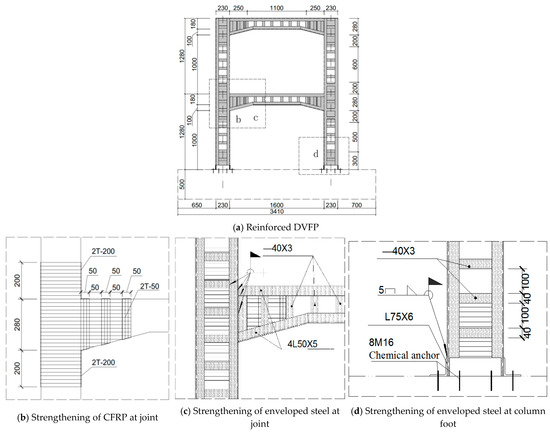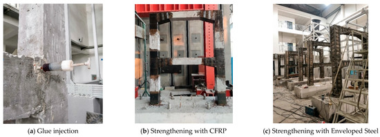 The reinforcement method of the specimens was based on references [20], specimens KJD-1, KJD-2 and KJD-3 were reinforced by the same measures, and two layers of CFRP were pasted at the column foot and joints in order to avoid premature failure of the plastic hinge area of the specimen. The column and cover beam were reinforced by enveloped steel, and the enveloped steel at the column foot was fixed on the base by a chemical anchor. The reinforcement design of specimens and on-site photographs are illustrated in Figure 5 and Figure 6, respectively. The enveloped steel ratio of column and cover beam is 2.33% and 3.11%, respectively, while the batten plate stirrup ratio is 0.77% and 0.79%, respectively, and the volume ratio of CFRP circumferential girth is 0.58%. As the first reinforcement step, the polymer cement mortar was used to repair the defective part after removing the surface of the loose concrete, and the second step was to inject mucilage to the cracks. Finally, CFRP and enveloped steel reinforcement construction were carried out after polymer cement mortar and mucilage solidification.