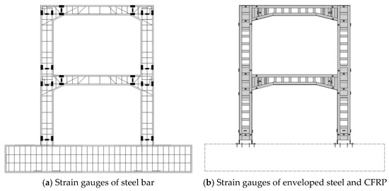 The horizontal load and horizontal displacement were recorded by the actuator. The strain of longitudinal reinforcement and stirrup in the potential plastic hinge area of column, the strain of section steel and batten as well as the strain of the CFRP at the cover beam and column were measured and recorded by strain gauges. The obtained layout of the strains is illustrated in Figure 7.