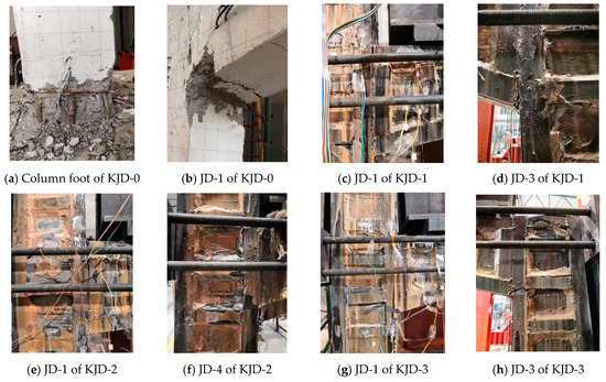 At the first cycle of displacement of ±18 mm, the strain of angle steel at the foot of column LZ1 exceed the yield strain; the weld of enveloped steel of joint JD1 was pulled off, accompanied by cracking sounds. At 99 mm, the concrete of JD1 and JD3 was seriously crushed, CFRP was obviously bulged, the CFRP at the foot of column was fractured, and a small amount of concrete debris was spalled. Figure 8g,h illustrate the failure mode.