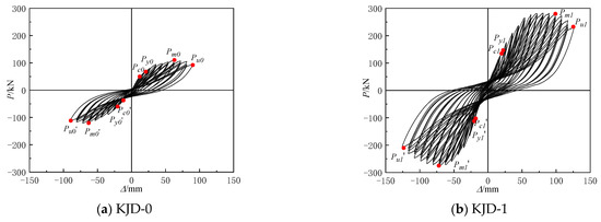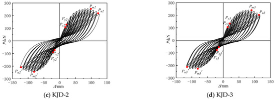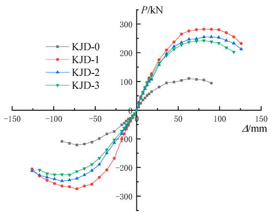 As is can be seen from Figure 10, compared with KJD-0, the ultimate displacement of reinforced specimens KJD-1, KJD-2 and KJD-3 has significantly increased. After the bearing capacity reached the peak load, CFRP and enveloped steel can effectively restrain the development of concrete cracks. The descending section of the skeleton curve is relatively gentle and exhibits a good ductility. The bearing capacity of specimens decreases faster with the increasing pre-damage degree. The ranking of the bearing capacity of the reinforcement specimens during forward loading is KJD-1 > KJD-2 > KJD-3, and significantly larger than KJD-0.
