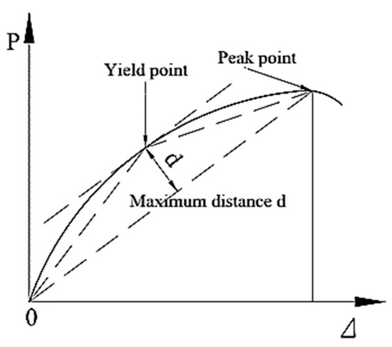 The displacement ductility coefficient is commonly used to express the plastic deformation performance of the specimen. Since there is no obvious yield point in the skeleton curve, the farthest point method proposed in the literature [21] is used to calculate the yield displacement, which is simple and feasible, and the calculation results are close to those of the graphical method and the equal energy method, and the schematic diagram of the farthest point method is shown in Figure 11. The displacement corresponding to the load dropping to 85% of the peak load is taken as the ultimate displacement. The displacement ductility factor μ is defined as the ratio of the ultimate displacement Δu to the yield displacement Δy [22]; it is calculated as follows: