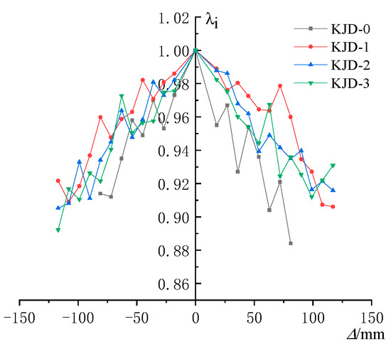 Pi,1 and Pi,3 represent the peak load of the first cycle and the third cycle at the ith drift level, respectively [23]. The relationships between λ and Δ are plotted in Figure 12. The stiffness degradation coefficient Ki can be defined as
