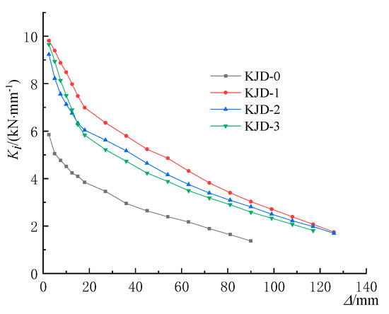 Pm,i represents the peak load of the ith drift level in the half cycle; Δm,i represents the peak displacement of the ith drift level in the half cycle level [24]. The relationships between K and Δ are plotted in Figure 13.