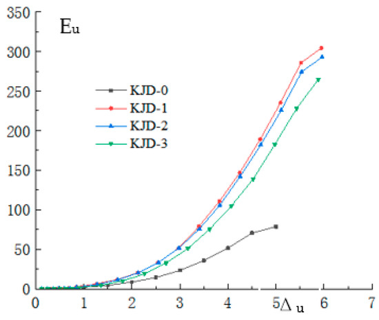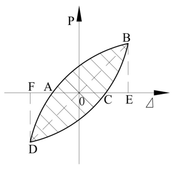 The energy dissipation capacity of the specimens was evaluated using the cumulative hysteresis energy dissipation Eu and the energy dissipation coefficient E. The calculation method of energy dissipation coefficient was shown in Figure 14 and its expression in Equation (4). The relationship between the cumulative hysteretic energy dissipation and the displacement ductility ratio μ∆ (the ratio of loading displacement to yield displacement) of each specimen is shown in Figure 15.