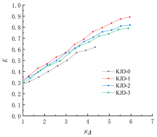 The energy dissipation coefficient curve of each specimen is shown in Figure 16. When the displacement ductility coefficient is less than 1, the specimen is in the elastic working stage, and the coefficient is not significant to study. Therefore, only the energy dissipation coefficient after yielding is calculated. It is seen that, at yielding, the energy dissipation coefficients of all specimen are similar. With the increasing loading, E grows smoothly, and the growth rate of the comparison specimen KJD-0 is smaller than that of the reinforced specimens.