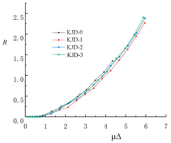 The residual displacement coefficient curve is shown in Figure 17. It is seen that the residual displacement coefficient of each specimen varies basically with the displacement ductility ratio. When the displacement ductility ratio is less than 1, the residual displacement coefficient is equal to 0. When the displacement ductility ratio is greater than 1, the residual displacement coefficient changes linearly with the displacement ductility ratio. Under the same displacement ductility ratio, the residual displacement coefficient of KJD-1 is lower than that of the prototype contrast specimen KJD-0, and the residual displacement coefficients of KJD-2 and KJD-3 are also slightly lower than that of the prototype contrast specimen KJD-0. It is shown that the composite reinforcement of CFRP and enveloped steel can slow down the growth of residual displacement coefficient.