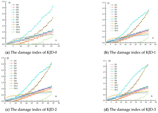 D6 increases rapidly in the early stage, but tends to be flat in the later stage, which is inconsistent with the actual damage process of the specimen. D2 [28] and D9~D12 [35,36,37,38] have less damage before yielding, which is consistent with the actual situation in the early stage. The damage index of D7~D9 [33,34,35] in the later stage exceeds 1, which overestimates the damage degree of the specimen during the loading process. When the specimen reaches moderate damage, the damage index of D12 [38] is still small, which does not conform to the actual situation. The damage index calculated by D5 [31], D10 [36], and D11 [37] is small in the early stage, and gradually increases during the loading process.