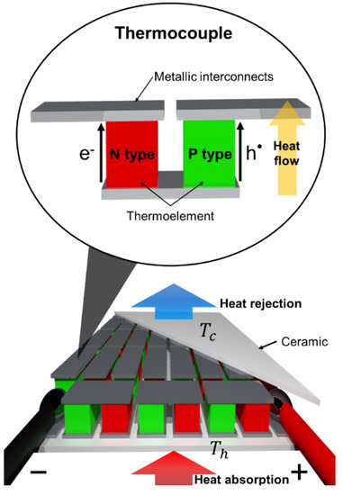 A TE device takes the form of a series of thermopiles (Figure 2), i.e., thermocouples wired in series [9,10,11]. A thermocouple consists of two thermoelements connected together in series and thermally in parallel [12]. The two thermoelements are made of n-type and p-type semi-conducting materials, which generate an electrical potential in the presence of a temperature gradient [13,14,15].