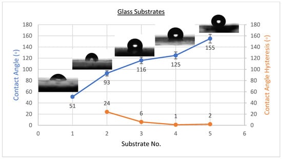 As shown in Figure 1, the WCA on uncoated steel was about 54 ± 3°, and it was 90 ± 2° when coated with PVDF only, but it climbed to a high of 157 ± 2° upon addition of 2.5 g of CeO2 nanoparticles. WCA was 71 ± 3° on uncoated Al substrates and 91 ± 2° when coated with PVDF only, with an extreme of 147 ± 2° when 2.5 g CeO2 nanoparticles were added, as revealed in Figure 2. WCA on glass substrates was roughly 51 ± 3° prior to coating, 93 ± 2° after coating with PVDF alone, and 155 ± 3° after adding 2.5 g CeO2 nanoparticles, as illustrated in Figure 3. The amount of 2.5 g of CeO2 coating on each substrate exhibited the minimum water contact angle hysteresis (WCAH) ranging from 1 ± 0.5° to 5 ± 1 compared with the uncoated specimens or PVDF alone.