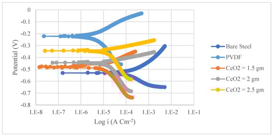 The corrosion resistance of PVDF and PVDF/CeO2 composite coatings was determined using potentiodynamic polarization curves (Tafel). Figure 4 and Figure 5 show the Tafel polarization curves for steel and Al substrates, respectively, for uncoated substrates; PVDF-coated substrates; and PVDF + 1.5, 2, and 2.5 g CeO2-coated substrates at a scan rate of 2 mVs−1 in 3.5 wt. percent NaCl solution. Table 2 provides a summary of the Tafel analysis for the polarization curves.