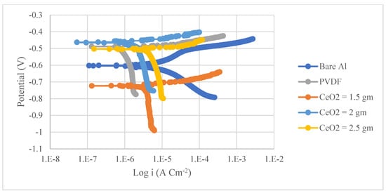 Tafel analysis of uncoated substrates, PVDF alone, and composite coatings (PVDF + 2.5 g CeO2) after immersion in a 3.5 percent NaCl aqueous solution; 2 mVs−1 was the scan rate.