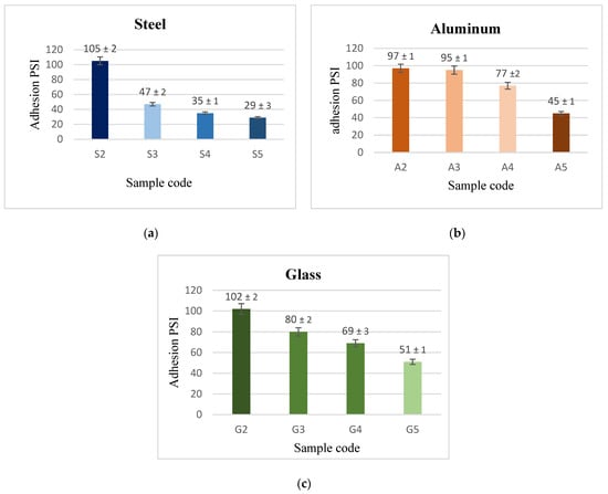 Force of adhesion between (a) steel, (b) Al, and (c) glass substrates, and PVDF alone and PVDF + CeO2 coatings.