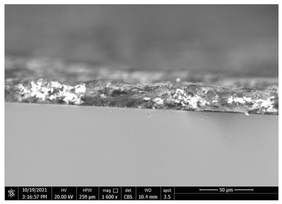 The substrate’s surfaces contact area with the heavy adhesive PVDF decreased with the addition of CeO2, which allowed some nanoparticles to settle at the interface between the substrate and coating, as shown by the bright areas in the crosscut in Figure 7. In terms of adhesive superhydrophobic properties, coatings of (PVDF + 2.5 g CeO2) are preferable, as this combination combines superhydrophobicity with moderate adhesion.