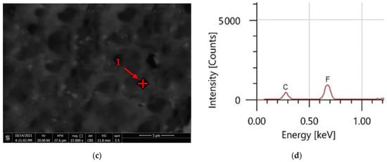 (a–c) PVDF alone coatings at various magnifications and (d) EDS peaks of point 1 in image (c).