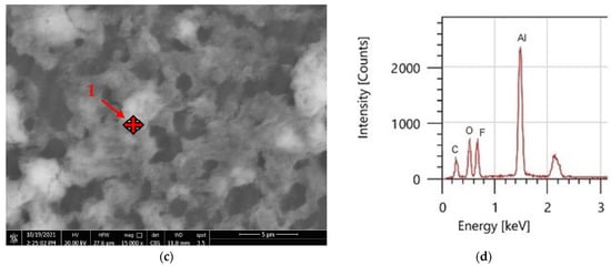 The surface morphology of the generated coatings was investigated using SEM at various magnifications. Figure 8a–c show sponge-like structures in the hydrophobic surface microstructure, showing that the coating layer is predominantly formed of PVDF polymer at high magnification [27,41]. The hydrophobic sample has a uniform surface structure with slight roughness. There are other massive microvoids beyond these formations. Figure 8c shows how EDS was utilised to check the composition of PVDF polymer. According to EDS studies, PVDF material consists mostly of two fluorine (F) and carbon (C) peaks.