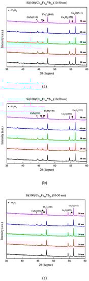 Figure 1 displays the XRD patterns of thin films with as-deposited and annealed thicknesses ranging from 10 nm to 50 nm. Figure 1a depicts the patterns of thin films formed at RT, while Figure 1b–d depicts the patterns of post-annealing treatments. The body-centered cubic (BCC) CoFe(110) peaks were observed at around 2θ = 44.7°, indicating that the Co40Fe40Yb20 thin films were crystallized, except when annealed at 300 °C. The Yb2O3 and Co2O3 oxide peaks appeared at 2θ = 46°, 46.3°, 47.7°, 55.4°, 54.6°, and 56.4° in all samples. Oxidation peaks were formed as a result of the sputtering system, natural oxides on the Si (100) substrate, and oxygen contamination on the sputtering target [21]. With increasing thickness and annealing temperature, all oxide peak intensities decreased. All thicknesses had the same level of oxidation, and as thicknesses became thinner, the proportion of oxides increased. As a result, as the thickness increased, the intensity of the oxide peaks gradually decreased. The weakening oxide peak may have beneficial effects on the magnetic and electrical properties by reducing interference. The variation in the average lattice parameter determines the strain in CoFe films. This lattice strain might be either tensile or compressive. The lattice strain was calculated using the relation [22]: