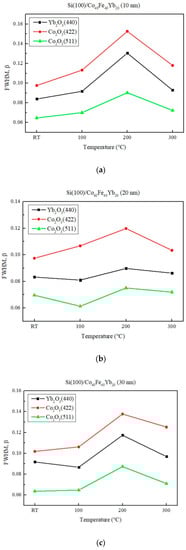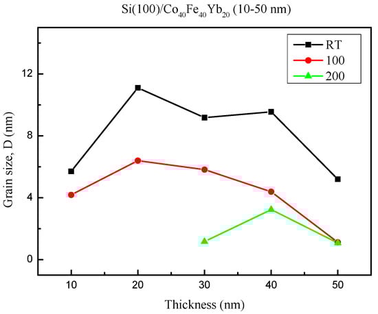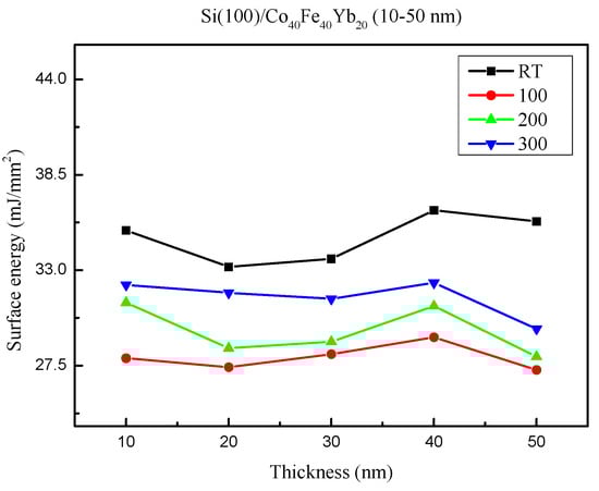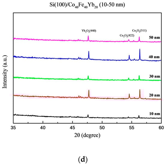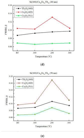 To demonstrate that the more oxidation effect of thinner thickness and lower annealed temperature is stronger than thicker thickness and higher annealed temperature, the FWHM of oxide diffracted peaks is shown in Figure 3a–e. From this result, it indicates that the FWHM of thinner thickness and lower annealed temperature is weaker than thicker thickness and higher annealed temperature, suggesting that the oxidation effect is more apparent in thinner thickness and lower annealed temperatures. The magnetic, electrical, surface energy, and hardness of Co40Fe40Yb20 films are significantly influenced by their degree of oxidation.