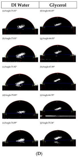 Figure 4A–D show the contact angles (θ) of Co40Fe40Yb20 films under four conditions. The contact angles of the films were examined using DI water and glycerol. In particular, the Co40Fe40Yb20 films were observed to have contact angles that were always less than 90° and the drops were nearly spherical, demonstrating the films had good hydrophilicity and wettability. Surface energy and adhesion are significant factors because the Co40Fe40Yb20 film can be used as a seed or buffer layer. The contact angle decreases due to significant liquid absorption when the surface energy is high. Using Young’s equation and the contact angle, the surface energy is computed [16,17,18].
