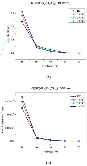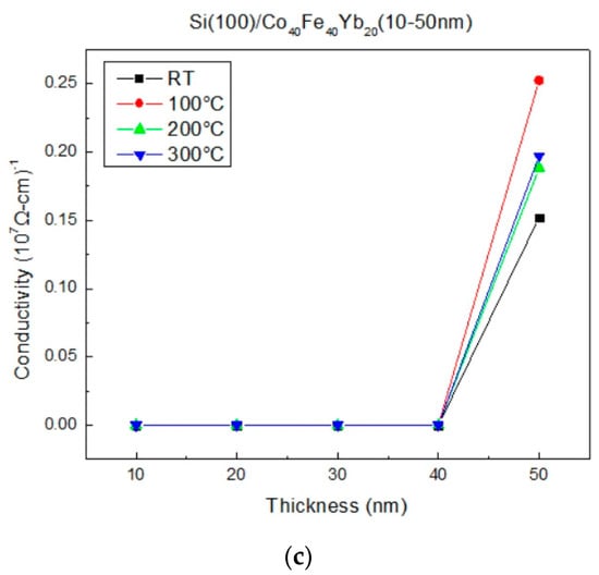 The resistivity and sheet resistance of Co40Fe40Yb20 films under all conditions are depicted in Figure 6a,b. The results confirm that resistance decreased significantly when the thickness and higher annealing temperatures increased due to the oxidation effect of thinner thickness. The electrical resistivity of CoFeYb films varies with changes in carrier concentration and charge carrier mean free path. The thickness of the film is comparable to the mean free path of charge carriers when it is sufficiently thin. It is worth noting that charge carrier collisions with the surface account for a sizable proportion of total collisions [27]. When the thickness is equal to the mean free path of the charge carriers, the resistivity is expected to be thickness dependent. It is also speculated that thicker and higher annealing temperatures have less oxidation effect, reducing the resistance of the current in the flow and reducing the resistivity. Figure 6c illustrates the conductivity of Co40Fe40Yb20 films under all circumstances. From the findings, it can be also indicated that higher annealed temperatures have a lesser oxidation effect, which increases conductivity and carrier mobility while decreasing resistance [28].