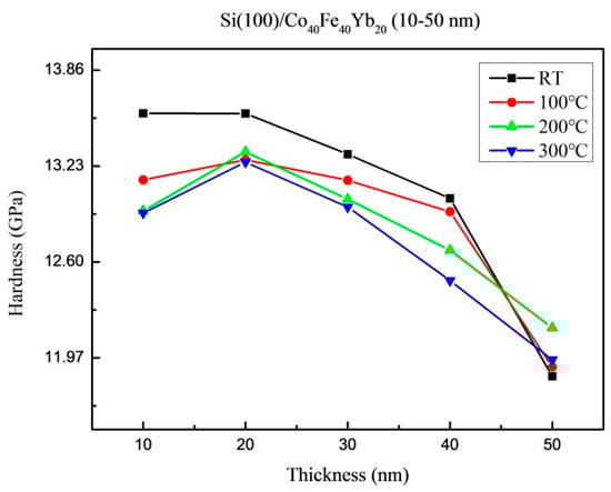 The hardness of Co40Fe40Yb20 films under all conditions is shown in Figure 7. The hardness ranged between 11.84 GPa and 13.57 GPa. As-deposited and thinner films have higher hardness than annealed films because more oxidation effect makes dislocations difficult to move and causes strong mechanical characteristics [29]. With thicker thickness, the hardness exhibits a decreasing tendency. Due to its excessive thinness, the thickness is influenced by the substrate, and the stress change it causes is inversely correlated with the film’s thickness. The loading and unloading curves can be used to calculate hardness using the Pharr-Oliver method, which reveals the combined hardness of the silicon substrate and CoFeYb films [30]. As the CoFeYb layer is so thin, it is reasonable to assume that a substrate effect must exist in the nanoindentation measurement [31,32].