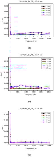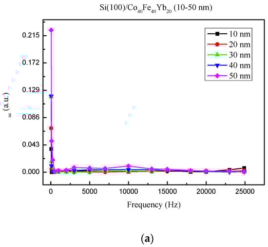 The low-frequency alternative-current magnetic susceptibility (χac) is displayed in Figure 8a–d under four different conditions. The value of χac decreases with frequency in the low-frequency range of 50–25,000 Hz. The outcomes also demonstrate that as film thickness is raised, the associated χac value rises. Figure 8 illustrates the sharp frequency reduction in the χac values. Furthermore, the as-deposited films revealed a maximum χac value of 0.224 at 50 nm. Meanwhile, post-annealing 100 °C films had a maximum χac value of 0.058 at 50 nm, while post-annealing 200 °C films had a maximum χac value of 0.340 at 50 nm. The maximum χac value was 0.165 at 50 nm in the post-annealed 300 °C films.