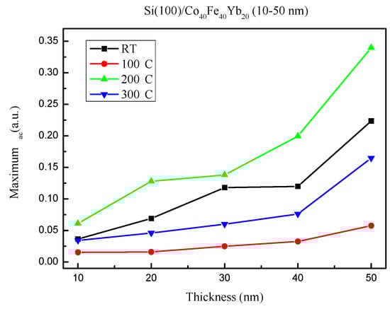 Figure 9 depicts the maximum χac values for various thicknesses under four conditions. The maximum χac value increases as the thickness increases due to the thickness effect [33]. Due to the annealing treatment and less oxidation effect, the highest χac value was 0.340 at post-annealing 200 °C with 50 nm. Moreover, the χac of as-deposited is larger than 100 °C and 300 °C, owing to magneto-crystalline anisotropy [34,35].