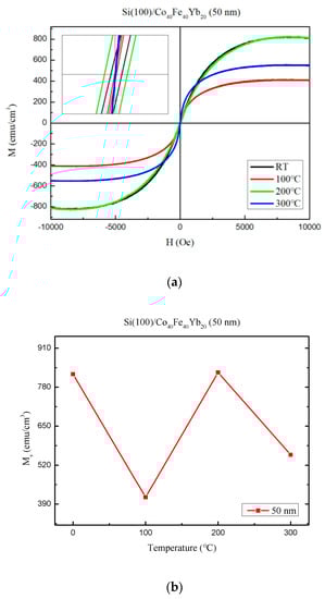 Because it has the maximum χac at 50 nm, it discusses its magnetic characteristics at different annealed temperatures. The magnetic hysteresis loop of the Co40Fe40Yb20 films is shown in Figure 10a for four conditions at 50 nm. For observing the saturated magnetic spin state, an in-plane external magnetic field (Hext) of 10 kOe is sufficient. An increased version of the figure shows a low Hc, which in Co40Fe40Yb20 films indicates a soft magnetic characteristic. Figure 10b depicts the Ms of Co40Fe40Yb20 films at 50 nm with various treatments. The maximum value of Ms is found to be at post-annealing 200 °C with 50 nm, which is consistent with χac. The Ms and χac annealed at 300 °C with 50 nm are smaller than 200 °C due to thermal disturbance and more oxidation effect. When the post-annealing is at 100 °C, the Ms significantly decreases in the phenomenon, mainly due to the compensation temperature effect [37].