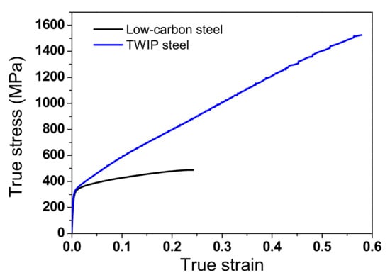 Comparison of true stress–strain curves of low-carbon and TWIP steels in tensile test.