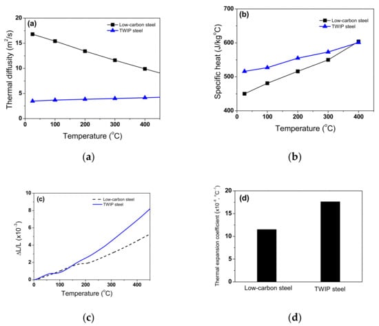 The ρ, cp, α, k, and βL values of a metal are dependent on temperature. Figure 3 compares the measured α, cp, and βL of the low-carbon and TWIP steels as a function of temperature. βL was calculated using the following equation []: