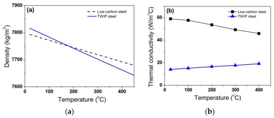 where m is mass. As expected, ρ decreased with temperature, as shown in Figure 4a, which is consistent with the previous results [,]. Meanwhile, ρ of TWIP steel was more sensitive to temperature compared with low-carbon steel owing to the high βL of TWIP steel.