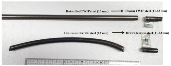 Before analyzing the results of the FEA of the drawn wire with the thermal properties, the accuracy of the FEA model was validated by comparing the measured and simulated drawing forces and core temperatures of the two steels. Figure 6 shows the photograph of the hot-rolled and drawn low-carbon and TWIP steel wires.