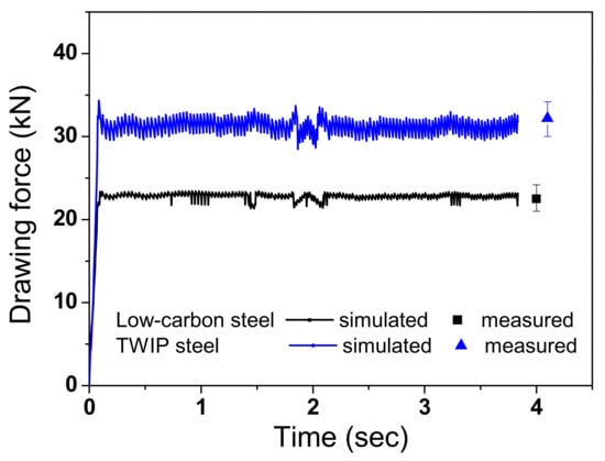 Figure 7 shows a comparison of the numerically simulated and experimentally measured drawing forces of the two steels. Small fluctuations were observed with time in both the measured and calculated drawing forces. The numerically simulated drawing forces were in good agreement with the measured equilibrium values. The drawing force of TWIP steel was higher than that of the low-carbon steel.