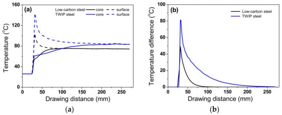 Comparison of numerical simulation results of (a) temperature profiles along the drawing direction at core and surface regions and (b) temperature difference between core and surface regions of low-carbon and TWIP steels.